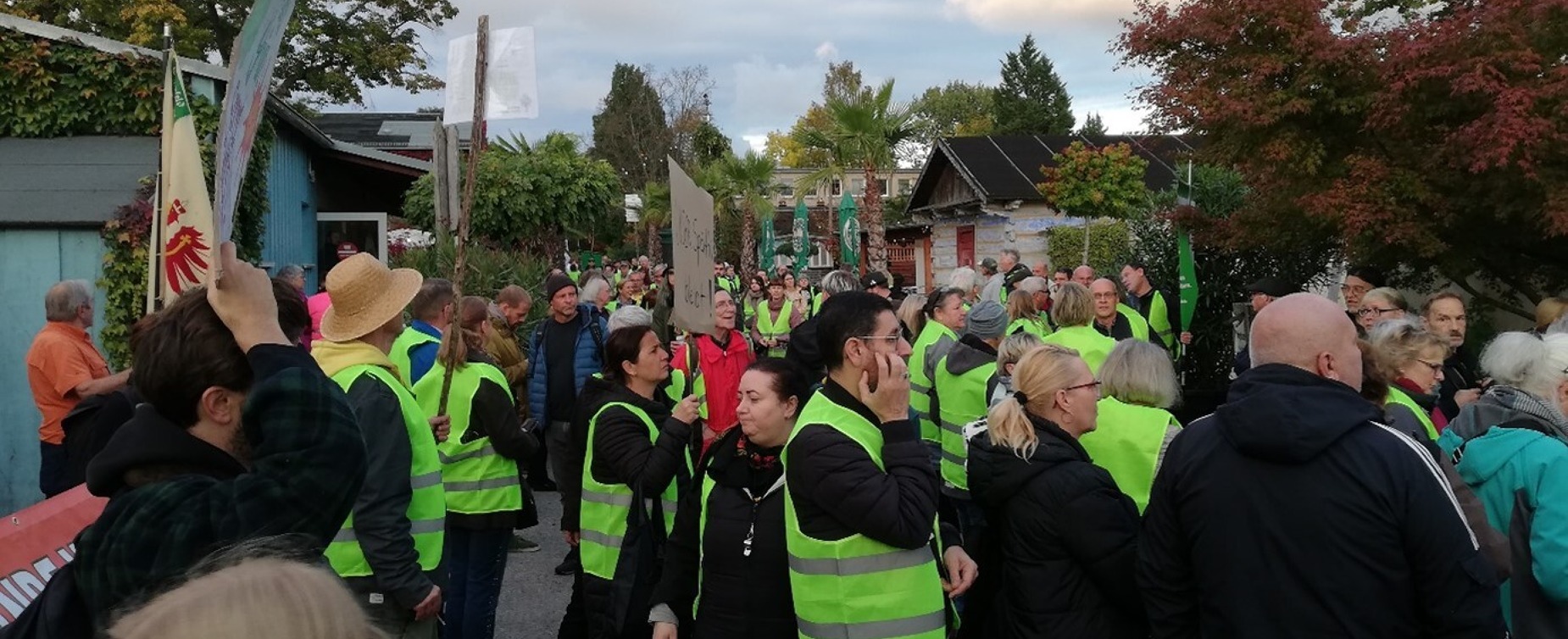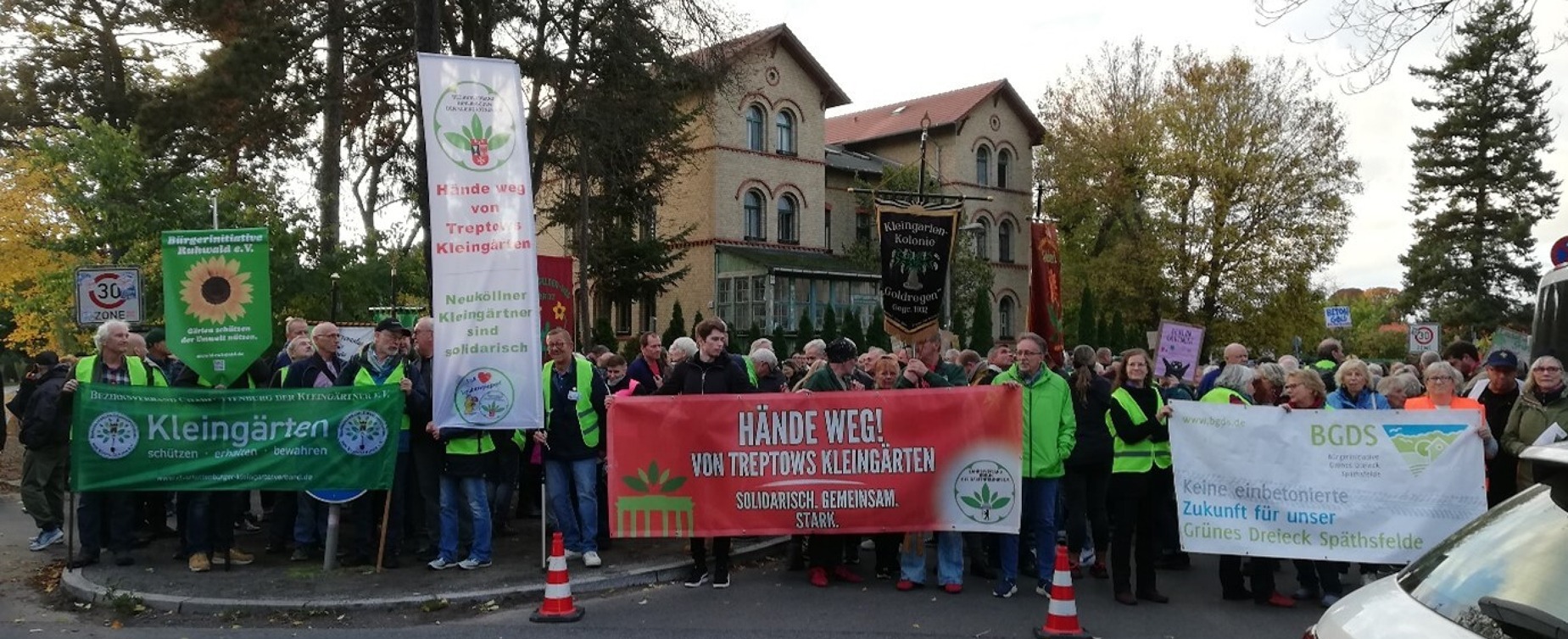 Zur Demonstration hatte der Landesverband Berlin der Gartenfreunde e. V. und die Initiative „Grünes Dreieck Späthsfelde“ aufgerufen. Besonders stark vertreten waren die Kleingärtnerinnen und Kleingärtner aus den betroffenen Vereinen vor Ort. Doch die Solidarität reichte weit über Treptow hinaus: Bezirksverbände aus ganz Berlin – darunter Neukölln, Lichtenberg, Charlottenburg, Reinickendorf, Marzahn, Weißensee, Wedding und Wilmersdorf – unterstützten ihre Treptower Kolleginnen und Kollegen. Mit Bannern, Warnwesten und klaren Botschaften zeigten sie: Die Berliner Kleingartenbewegung steht zusammen.
